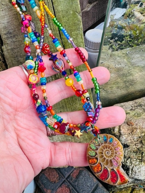 Custom Magic Rainbow Opal Glass Ammonite beaded necklace Opal Gemstone Crystal and Vintage beads OOAK