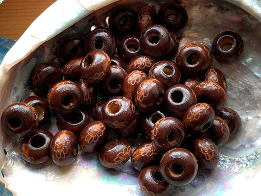 Deep brown wooden spacers rondelle beads from Bali etched flower design.15x10mm