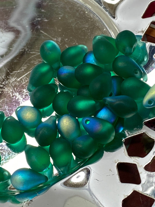 Amazing Glowy Firepolished Teal Green Matte Czech Glass Drops 6 x 9 mm / 4 beads / Teardrops Briolette Drop Beads / crystal glass